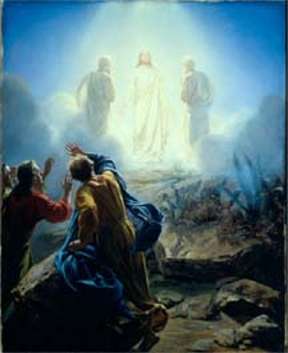 He therefore leaves the rest of His disciples in the plain near Nazareth, and goes in company with the three privileged ones towards a high hill called Thabor, which is a continuation of Libanus, and which the psalmist tells us was to rejoice in the name of the Lord. (Ps. lxxxviii. 13.) No sooner has He reached the summit of the mountain, than the three apostles observe a sudden change come over Him; His Face shines as the sun, and His humble garments become white as snow. They observe two venerable men approach and speak with Him upon what He is about to suffer in Jerusalem. One is Moses, the lawgiver; the other is Elias, the prophet, who was taken up from earth on a fiery chariot without having passed through the gates of death. These two great representatives of the Jewish religion, the Law and the Prophets, humbly adore Jesus of Nazareth. The three apostles are not only dazzled by the brightness which comes from their divine Master; but they are filled with such a rapture of delight, that they cannot bear the thought of leaving the place. Peter proposes to remain there for ever and build three tabernacles, for Jesus, Moses, and Elias. And while they are admiring the glorious sight, and gazing on the beauty of their Jesus' human Nature, a bright cloud overshadows them, and a voice is heard speaking to them: it is the voice of the eternal Father, proclaiming the Divinity of Jesus, and saying: `This is My beloved Son!'