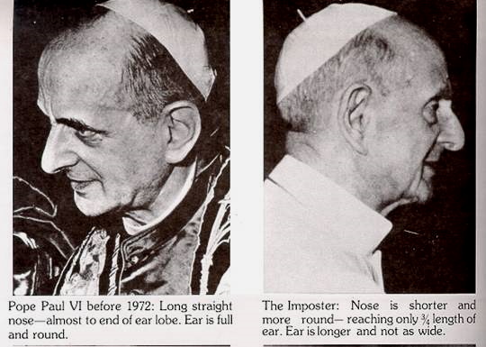 "This impostor, who has been given the image of the Pope, Our Vicar Paul VI, will pose and assume a role of compromise to the world. It is the plan of the evil ones about him ... to discredit your Vicar by placing him in print and photographs in a compromising position to destroy him."  - Our Lady, April 10, 1976