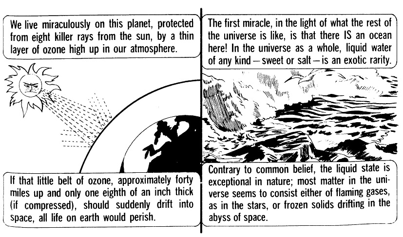 miraculously on this planet, protected from eight killer rays from the sun, by a