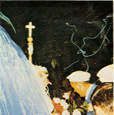 Kodak Instamatic photo on Shrine grounds during the Vigil of June 15th, 1974, taken by Alfred P. Dolan, shows the blue beaded strands typically representative of rosary beads.