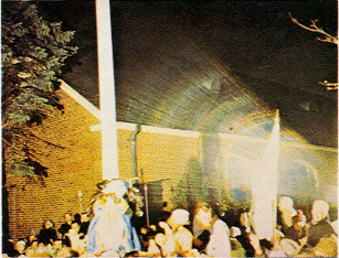Bayside Shrine Grounds before old St. Robert Bellarmine Church, now a gymnasium. Photo shows Vigil of December 7, 1973, with rainbow spray of light emanating from unknown source. Miraculous photograph depicts the spot of the spring that will erupt suddenly on the sacred grounds with curative properties as in Lourdes. Taken by Joseph Schultis of Michigan.